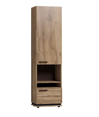 Благородный древесный оттенок шкафа, контрастирующий с черными ручками из массива дерева, подойдет к большинству цветовых решений – мебель будет легко комбинировать с другими предметами. Высокий шкаф МЦН удобен своей функциональностью и эргономичностью конструкции. На открытой полке разместите фотографии или элементы декора, а за глухими фасадами спрячьте документы и ценные вещи от посторонних глаз. Регулируемые опоры шкафа позволят компенсировать незначительные неровности пола.