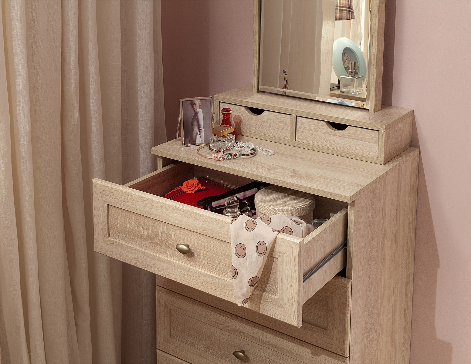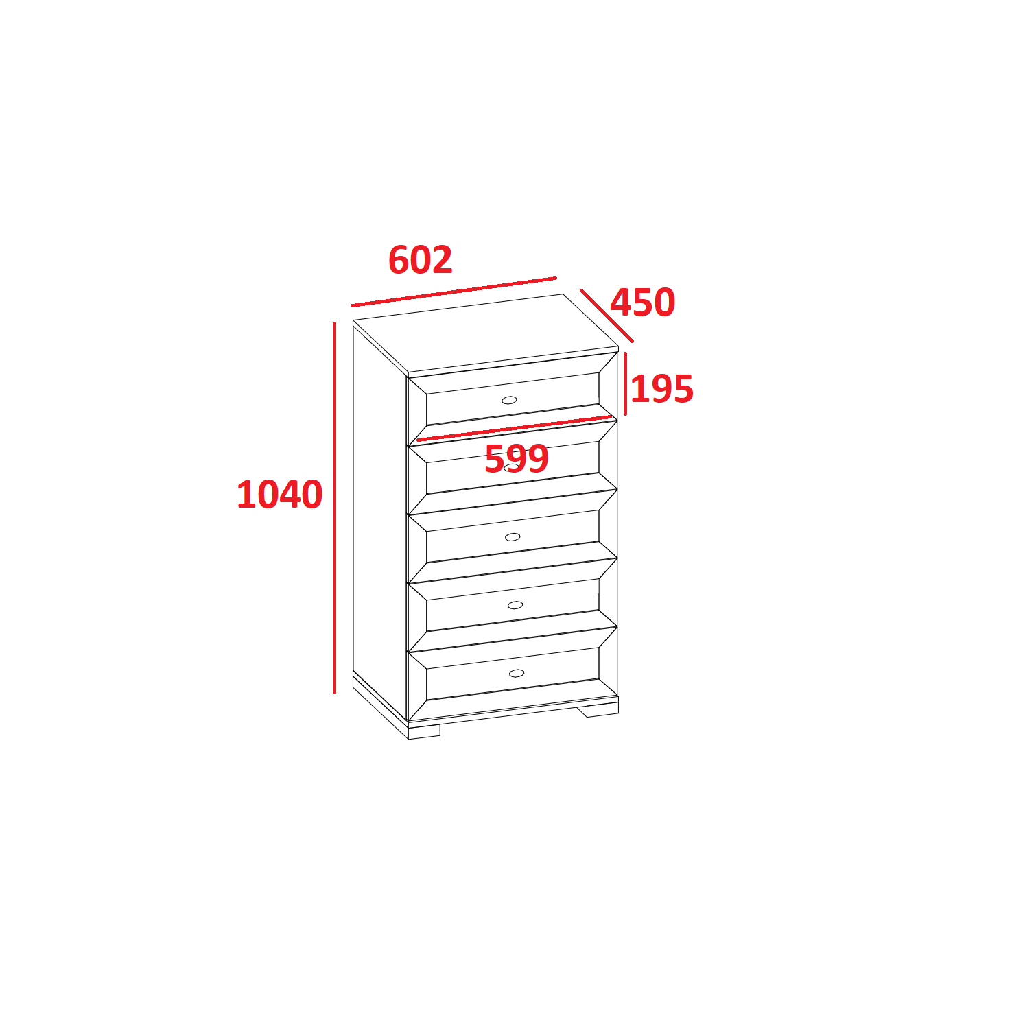 Высокий комод с пятью вместительными ящиками - незаменимый элемент мебели в спальне или гостиной. Модель комплектуется шариковым направляющими полного выдвижения, гарантирующими плавный и бесшумный ход. Габариты ящиков 54х35х14 см, максимальная нагрузка на каждый - 20 кг. Прекрасно сочетается с навесным зеркалом и трюмо из коллекции Sherlock.
