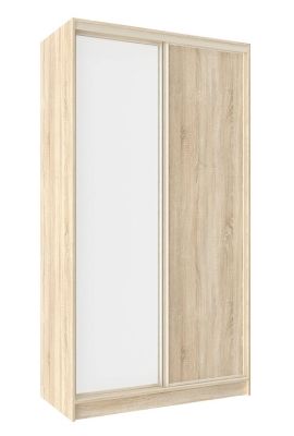 Вшкафу-купе шириной 120 смнайдется место для гардероба всей семьи. Разместите в нем бельё, верхнюю одежду и аксессуары. Продуманное внутреннее наполнение шкафа состоит из стеллажа для белья, четырех больших ниш внизу и вверху, а также стационарной штанги. Две двери настальном профиле "Найди"в цвет основного декора шкафа плавно перемещаются. Если нужно взять вещи из шкафа в темное время суток и при этом не разбудить супруга,установитеКарниз 202 Домашнийс подсветкой (опция).